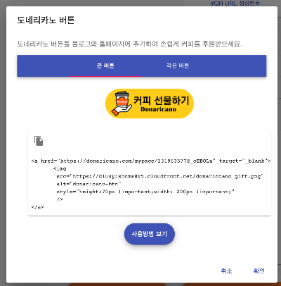 알맞은 버튼에 크기를 선택하여 소스코드를 복사합니다. 자세한 사용방법은 사용방법 보기 버튼을 클릭하시면 나옵니다. 저는 티스토리에 추가하는것이 목표이기 때문에 티스토리에 적용하는 블로그 주소를 참고했습니다.